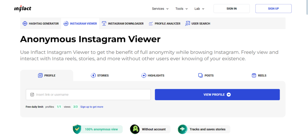 Inflact positions itself as a multi-purpose Instagram toolkit, offering not only anonymous viewing and downloading but also advanced analytics, profile analyzers, and a hashtag generator. It appeals strongly to marketers and researchers who need more than just anonymity.