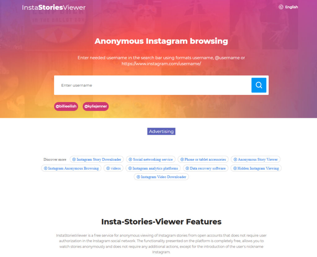 InstaStoriesViewer is designed for anonymous Instagram story and post viewing with no login or registration required. Its entire value lies in being a free, ad-supported anonymous viewer.